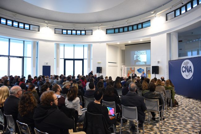 Gremita la Rotonda a Mare di Senigallia per il seminario formativo con Oliviero Toscani. Ad ascoltare il maestro della fotografia sono intervenuti in 180, di professioni diversificate e con provenienza da tutta Italia ed anche dall’estero. Affascinato dalla Rotonda a Mare situata proprio nella città della fotografia, Oliviero Toscani ha lanciato una proposta “Perché qui non ci fate uno studio fotografico? Se date la Rotonda a me ci porto il mio studio!”. Durante le tre ore di formazione Toscani ha proiettato i suoi scatti più iconici, i suoi più grandi successi, raccontando il dietro le quinte fatto di storie e idee. Nell’incontro dal provocatorio titolo “Chi non ha mai fatto una fotografia, alzi la mano”, ha sottolineato l’importanza dell’artigianalità e ha lanciato messaggi importanti puntando sull’unicità. “Provate ad aver fiducia in voi, magari siete anche molto meglio di quel che credete! Voi siete unici!”. Tra i messaggi lanciati anche quello di “dedicare tempo, durante il giorno, alla vostra immaginazione”. Parlando di ciò che lo spinge a fare ciò che fa ha sottolineato che lui “non fa il fotografo perché mi piace la fotografia, come la maggior parte dei fotografi, ma perché ho capito che la fotografia è la memoria storica dell’umanità”. Ha inoltre ironizzato su chi sui social fotografa “tramonti e sushi!”. Toscani si è poi concesso a selfie, fotografie e autografi. Il maestro è stato intervistato da Maurizio Paradisi presidente Cna Provinciale di Ancona, nonché fotografo professionista. Il seminario è stato il secondo appuntamento del format “I Maestri della Comunicazione” con cui Cna porta nelle Marche i grandi protagonisti della comunicazione italiana e internazionale; nella prima edizione del 2017 è stato protagonista Mauro Mortaroli.