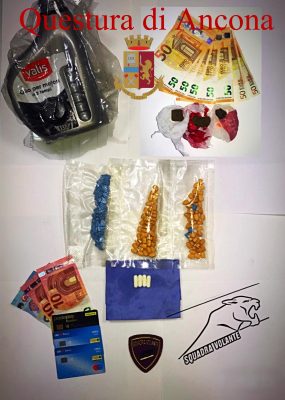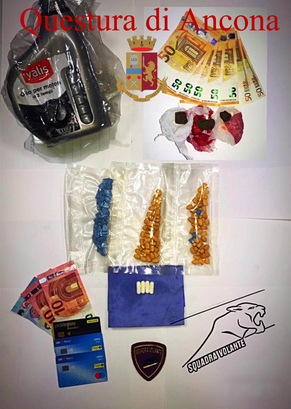 In viaggio dalla provincia di Macerata ad Ancona con un carico di 200 pasticche di ectasy, sigillate e immerse nell’olio motore per motocicli, riposte con le lattine dentro il portabagagli della vettura che guidava. Ma  l’automobilista  23enne spinge troppo sul pedale dell’acceleratore e viene intercettato proprio nel capoluogo di regione da una volante della Questura che lo ferma per un controllo. Dopo un’attenta ispezione della vettura, portata a termine con l’ausilio delle unità cinofile della Guardia di Finanza, salta fuori la droga, destinata probabilmente al mercato locale per lo sballo del sabato sera. Continuano i controlli della Polizia di Stato in tutto il capoluogo dorico. Come voluto dal Questore di Ancona Claudio Cracovia, decine di poliziotti della Questura e Commissariati hanno effettuato, unitamente alle unità cinofile antidroga ed agli agenti del Reparto Prevenzione Crimine Umbria Marche di Perugia, mirati controlli in occasione del ponte di Ognissanti. Eccezionali, anche questa volta, i risultati ottenuti: oltre al giovane arrestat,  ci sono stati 185 persone e 86 veicoli controllati, 8 le sanzioni al Codice della Strada per alta velocità, uso del telefono cellulare durante la guida, cinture di sicurezza, mancate revisioni ed assicurazioni. Nel capoluogo dorico, gli agenti delle Volanti hanno arrestato un 23enne della provincia di Macerata, trovato in possesso di 200 pasticche di ectasy, la micidiale droga composta da metilenediossimetanfetamina (Mdma), dagli spiccati e devastanti effetti psichedelici.