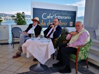 Questa la terrazza sul lago dell’hotel Lido’ alla presentazione il 17 giugno 2017 del libro Una tragedia dimenticata. Nella foto Maurizio Verdenelli, il presidente dell’Odg Umbria Roberto Conticelli e Luciano Magnalbo’