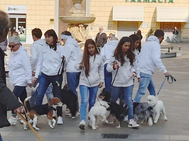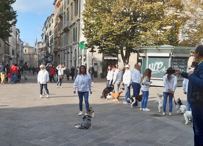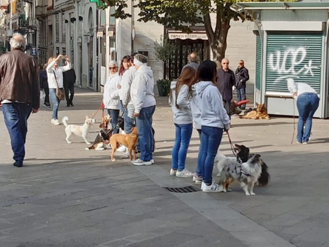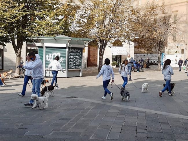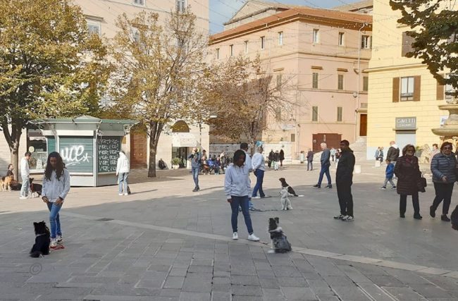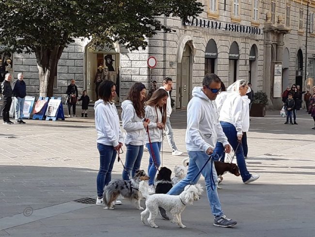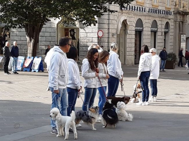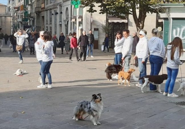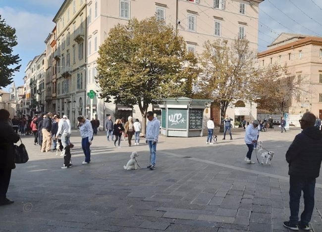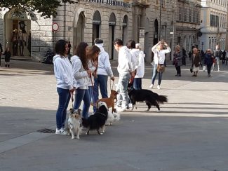 Flash mob in piazza con i cani dell’Anconagility. Oggi la simpatica incursione cinofila in piazza Roma degli allievi e istruttori di AnconAgility con i propri cani, tra lo stupore dei passanti – numerosi per la bella giornata di sole. Il gruppo ha improvvisamente regalato un’esibizione di educazione con i propri cani molto ben realizzata. Come in tutti i flash mob che si rispettino, nessuno era stato informato dell’iniziativa e da comuni passeggiatori mimetizzati tra i passanti gli allievi di AnconAgility si sono trasformati improvvisamente in protagonisti di una kermesse che li ha visti capaci di ordinare al proprio cane di rimanere seduto mentre il conduttore si allontanava nonostante il passeggio delle coppie, i genitori con i passeggini, i gruppi in conversazione domenicale. Una delle migliori prove di educazione e obbedienza per un cane è proprio riuscire a far sì che l’animale obbedisca in ogni situazione di vita quotidiana. Al termine del simpatico fevento la distribuzione di coloratissimi palloncini ha fatto felici i più piccoli.