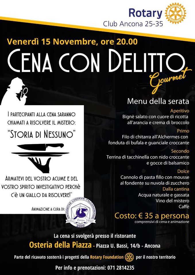 Il Rotary Club Ancona 25-35 organizza, in collaborazione con l’Associazione Arthur Conan Doyle, una cena con delitto gourmet. Durante l’evento, che si terrà venerdì 15 novembre alle ore 20 presso il ristorante Osteria della Piazza ad Ancona in Piazza Ugo Bassi 14/b, i partecipanti saranno messi alla prova con un caso da risolvere dal titolo “Storia di nessuno”. L’evento sarà l’occasione per gustare i piatti gourmet appositamente preparati dallo chef patron dell’Osteria della Piazza, Elis Marchetti, ma anche, e soprattutto, un’occasione per fare della solidarietà. Parte dell’incasso della serata, infatti, sarà devoluto alla Rotary Foundation che finanzia progetti di servizio in tutto il mondo.