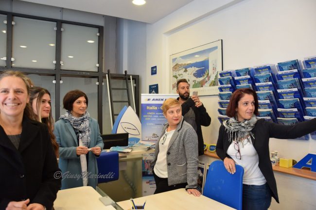 Da sinistra, Ilaria Volpini e Massimo Di Giacomo della Anek Lines e Dunia Romoli, dg Fintel, di fronte allo sportello ad Ancona