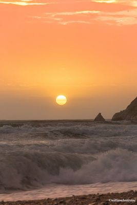 Il sole sorto da poco, il mare in tempesta e lo scoglio della Vela di Portonovo. Sono i protagonisti della foto scattata ieri mattina dal fotografo William Battistini.