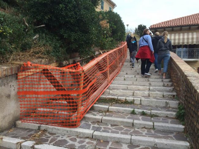 Il problema? Il muretto in cemento che delimita la via, ridotta ad uno strettissimo viottolo, sul lato sinistro, per chi sale verso la cima del colle Guasco, è moribondo, paurosamente inclinato, solcato da crepe in più punti, esemplare per gravità quella che spacca in due lo spigolo iniziale in basso del percorso. Insomma, quel muretto rischia di crollare. Nel giugno scorso il Comune ci aveva messo la classica “pezza”, ovvero addirittura transenne ai due sbocchi per impedire il passaggio pubblico. Ma tant’è, come segnalato allora da Cronache Ancona (leggi l’articolo), cittadini e turisti continuavano a spostarle per godersi la passeggiata panoramica, con bellissima vista su tutta la zona di via Birarelli, con la cima del Colle Cappuccini e il vecchio Faro ottocentesco, la chiesa di San Bartolomeo-San Gregorio Armeno (sec. XVI – XVIII) e, a quota più bassa, la chiesa dei Santi Teresa e Pellegrino (sec. XVIII popolarmente ribattezzata Degli Scalzi). Qualche settimana fa i tecnici dell’ufficio magazzino comunale su direttive dell’assessorato alle Manutenzioni, rimosse le inutili transenne, hanno scelto di posizionare la già citata opera di contenimento, lunga appunto oltre 30 metri, che oltre a costituire il classico “pugno in un occhio” rovinando l’effetto cartolina della zona, costringe i passanti a procedere a coppia; perché “l’opera” ha ridotto ulteriormente la sezione della scalinata. A rimanerci male soprattutto i crocieristi che sbarcano in porto il venerdì. Li abbiamo visti, arrangiarsi nel salire e scendere, per e da San Ciriaco, cercando di non inciampare e farsi male, perché anche gli scalini non godono certo di buona salute.