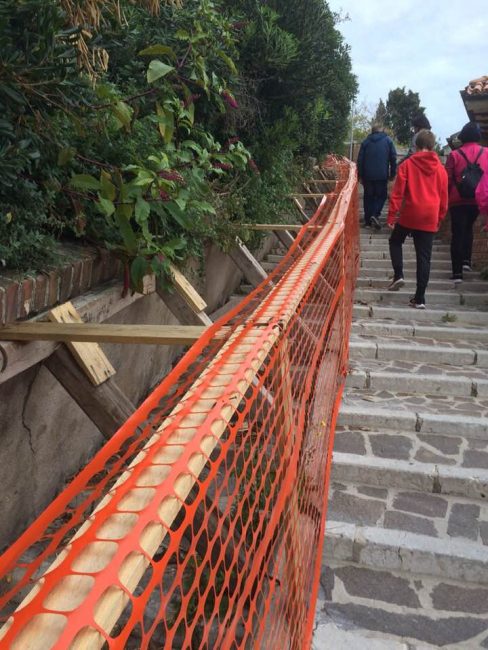 La facciata laterale dell’antica casa si affaccia sulla scarpata che costeggia il fianco sinistro dello scalone. E quando l’anno scorso il grande pino si abbatté sullo scalone, si trascinò dietro megazolle e radici. Conseguenza: lo smottamento scoperchiò la connessione tra l’impianto fognario pubblico sottostante e la condotta idrica che serve la villetta dove abita la famiglia. Con esalazioni nauseabonde dentro casa e fuori, nella zona scalone. La scarpata disastrata è di pertinenza della famiglia. Mario Sardi si rimbocca le maniche e piazza lungo la scarpata dei piccoli terrazzamenti fatti con tubi innocenti e tavolette di legno. Ma non può bastare. La scarpata è solcata da una grossa fenditura che arriva fino alla base circolare del tronco reciso del pino e da un buco. E per quanto la famiglia Sardi-Moretti ce la metta tutta ad isolare impianti igienici ed idrici, quelle profonde cicatrici al suolo non rendono affatto stagna la situazione: è evidente che serve, urgente, anche un intervento specifico, professionale e magari costoso, da parte di esperti comunali e dell’acquedotto. Oltre all’auspicato progetto comunale per ristrutturare il lungo muretto che dovrebbe contenere la pressione del terreno in declivio e rimuovere quegli orrendi 32 metri di intelaiature plastiche e di assi che dimezzano la sezione dello scalone “ex delle meraviglie”.
