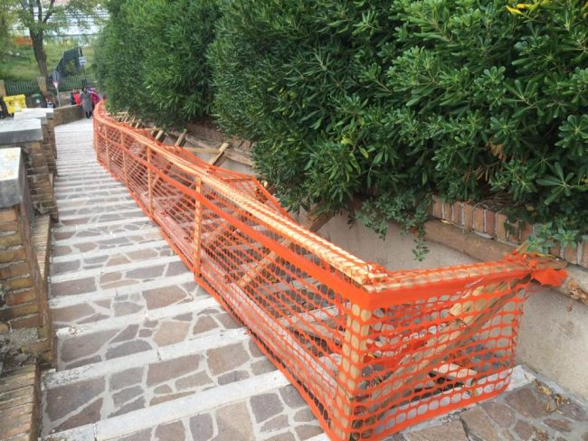 Il problema? Il muretto in cemento che delimita la via, ridotta ad uno strettissimo viottolo, sul lato sinistro, per chi sale verso la cima del colle Guasco, è moribondo, paurosamente inclinato, solcato da crepe in più punti, esemplare per gravità quella che spacca in due lo spigolo iniziale in basso del percorso. Insomma, quel muretto rischia di crollare. Nel giugno scorso il Comune ci aveva messo la classica “pezza”, ovvero addirittura transenne ai due sbocchi per impedire il passaggio pubblico. Ma tant’è, come segnalato allora da Cronache Ancona (leggi l’articolo), cittadini e turisti continuavano a spostarle per godersi la passeggiata panoramica, con bellissima vista su tutta la zona di via Birarelli, con la cima del Colle Cappuccini e il vecchio Faro ottocentesco, la chiesa di San Bartolomeo-San Gregorio Armeno (sec. XVI – XVIII) e, a quota più bassa, la chiesa dei Santi Teresa e Pellegrino (sec. XVIII popolarmente ribattezzata Degli Scalzi). Qualche settimana fa i tecnici dell’ufficio magazzino comunale su direttive dell’assessorato alle Manutenzioni, rimosse le inutili transenne, hanno scelto di posizionare la già citata opera di contenimento, lunga appunto oltre 30 metri, che oltre a costituire il classico “pugno in un occhio” rovinando l’effetto cartolina della zona, costringe i passanti a procedere a coppia; perché “l’opera” ha ridotto ulteriormente la sezione della scalinata. A rimanerci male soprattutto i crocieristi che sbarcano in porto il venerdì. Li abbiamo visti, arrangiarsi nel salire e scendere, per e da San Ciriaco, cercando di non inciampare e farsi male, perché anche gli scalini non godono certo di buona salute.