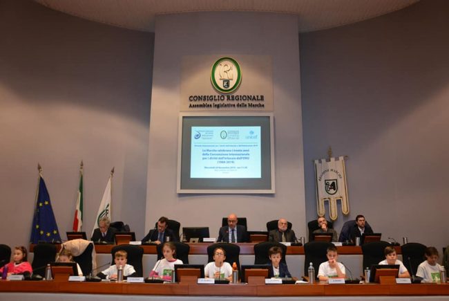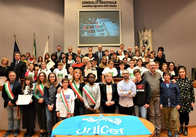 Oggi, giovedì 20 novembre, nel 30° anniversario della Convenzione Internazionale per i diritti dell’Infanzia, il Comune di Montemarciano è stato ospite nell’Aula consiliare della Regione Marche con una nutrita delegazione per celebrare l’importante ricorrenza con il presidente del Consiglio Regionale Antonio Mastrovincenzo, il garante Andrea Nobili e il presidente Unicef Italo Tanoni, i sindaci, gli Assessori e i piccoli sindaci e consiglieri dei 23 Comuni della Rete “Città sostenibili e amiche dei Bambini e degli Adolescenti”. Un’importante occasione per rafforzare il rapporto tra i comuni soci e ricevere gli attestati dalla Regione Marche per l’impegno profuso negli anni. “Oltre al riconoscimento di Montemarciano come Comune membro della Rete, – spiega una nota uffciale dell’ente locale – ci è stato consegnato l’attestato di riconoscimento della Consulta dei Giovani, organo rappresentativo della popolazione giovanile montemarcianese. Presenti i vicepresidenti della Consulta dei Giovani Francesco Cannas e Davide Giaccaglia, il Sindaco Damiano Barozzi, l’Ass. alle Politiche Giovanili Lorenzo Seta, la Dirigente Scolastica Angela Iannotta, il Presidente e il Segretario dell’Osservatorio Infanzia e Adolescenza Montemarciano Serenella Oreficini e Luciano Giulioni. Un percorso iniziato 5 anni fa con l’adesione al Protocollo di intesa promosso da Legambiente, Unicef, Ombudsman delle Marche e Ufficio scolastico regionale che oggi compie un grande salto in avanti, passando direttamente nella mani della Regione Marche che, in modo lungimirante, ha riconosciuto la necessità e la potenzialità di un progetto che mette al centro delle politiche il bambino”.