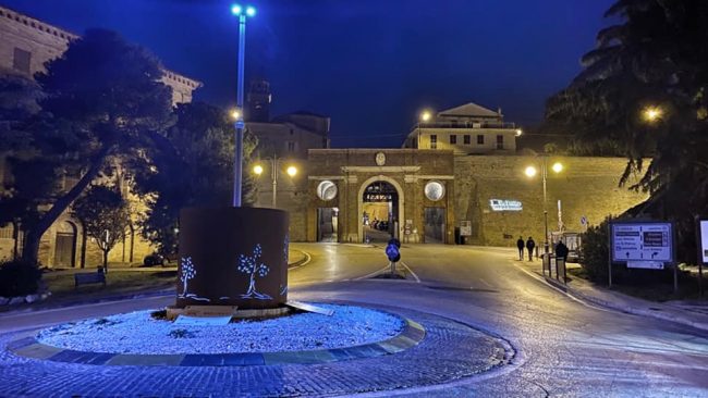 Ieri sera è terminato il montaggio delle luminarie natalizie nel centro storico di Osimo, Saranno accese il 30 novembre come l’albero di Natale, durante la tradizionale cerimonia di inaugurazione del calendario delle festività natalizie che quest’anno vede ancora tra le maggiore attrattive la pista di pattinaggio sul ghiaccio. Ma prima sempre ieri sera, in occasione della Giornata Mondiale dell’Infanzia e dell’Adolescenza che si celebra oggi 20 novembre, anche la città dei ‘senza testa’ ha deciso di accendere altre luci, per colorare di blu uno dei suoi monumenti simbolo, la scultura che rappresenta l’Ulivo della Pace ai Tre Archi. «La motivazione – spiega il vice sindaco Paola Andreoni- risiede nell’adesione del Comune di Osimo a “Go Blue”. Una iniziativa lanciata dall’Unicef per celebrare la Giornata Mondiale dell’Infanzia e dell’Adolescenza, che si celebra, appunto, ogni anno il 20 novembre nella ricorrenza dell’approvazione da parte dell’Assemblea Generale dell’Onu della Convenzione sui Diritti dell’Infanzia e dell’Adolescenza avvenuta 30 anni fa 1989-2019. Con l’iniziativa “go blue” l’Unicef chiede al mondo di dare a tutti i bambini un futuro migliore».