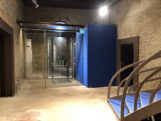 L’ingresso ristrutturato con porta a vetri in piazza Dante Alighieri visto dall’interno