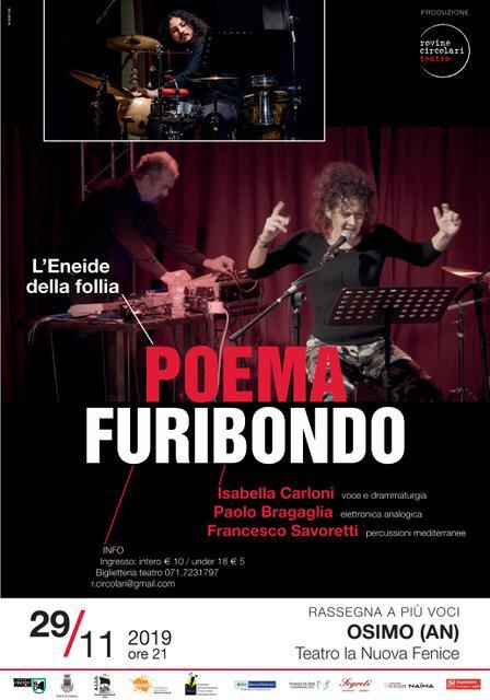 Intanto domani, venerdì 29 novembre, al teatro La Nuova Fenice di Osimo un’originale concerto teatrale chiude la rassegna ‘A più voci’ curata dall’Associazione Rovine Circolari in collaborazione con Comune di Osimo Regione Marche e Amat. Una serata musicale tutta made in Marche: Francesco Savoretti alle percussioni mediterranee, Paolo Bragaglia all’elettronica analogica e Isa Carloni alla voce e alla drammaturgia. Inseguendo il tema della furia e della follia femminile nell’Eneide, l’inedito trio rilegge uno dei poemi fondativi della cultura occidentale da una prospettiva contemporanea. L’incontro tra due artisti di mondi musicali lontani tra loro – quello dell’elettronica e quello delle percussioni mediterranee – con una performer vocale genera una contaminazione tra territori espressivi diversi e un inaspettato intreccio poetico che riflette in musica sulle origini della violenza.