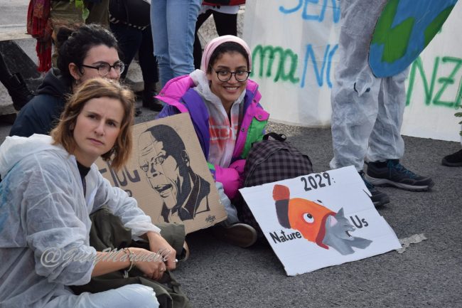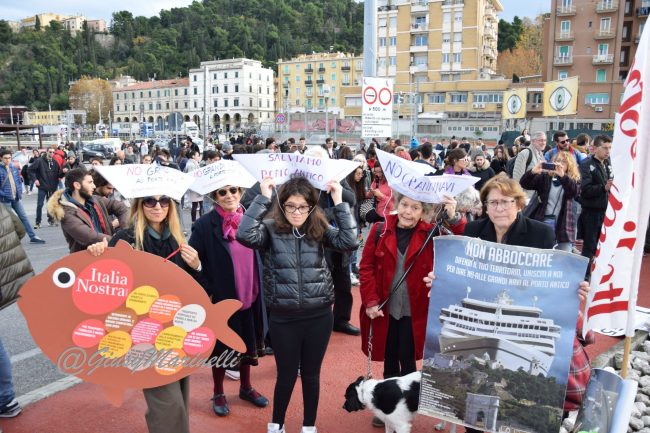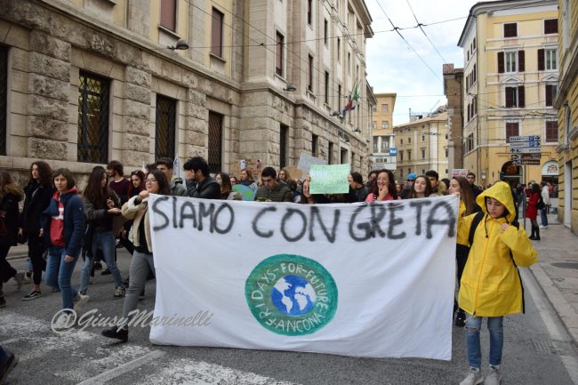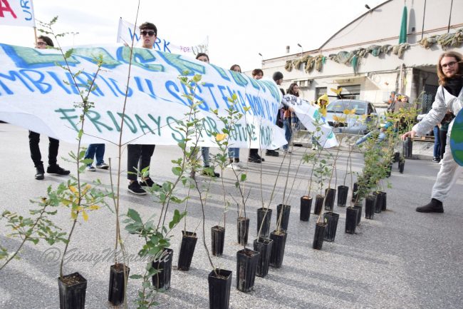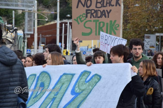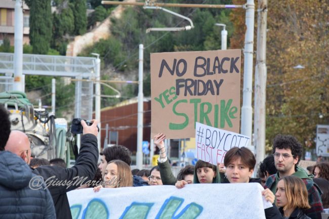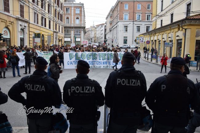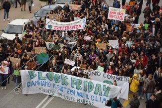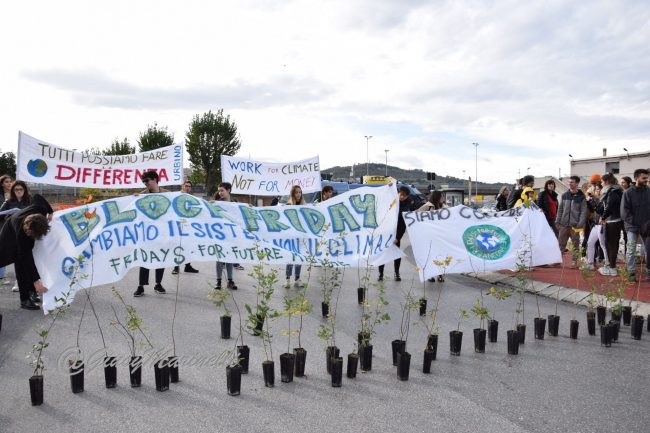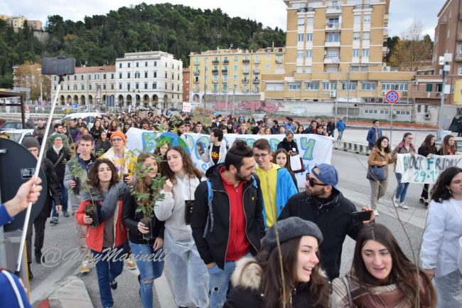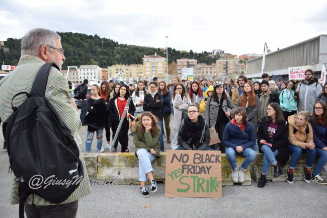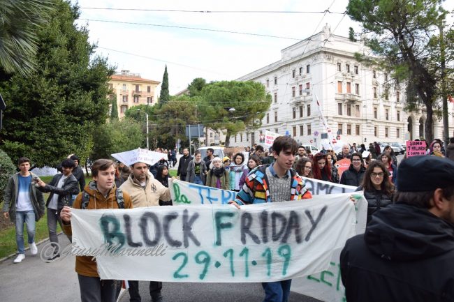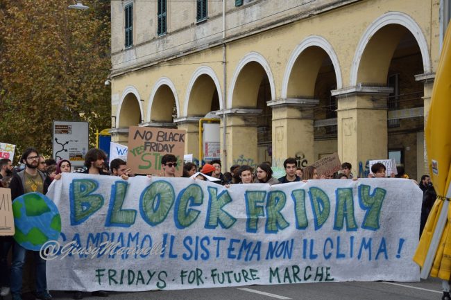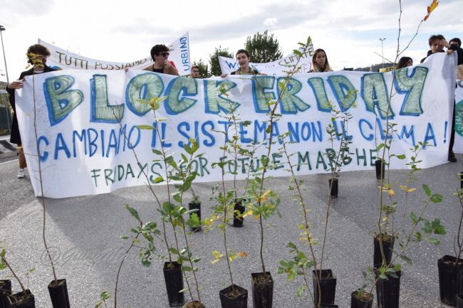«Dichiariamo il porto di Ancona bloccato per emergenza climatica». Arrivano da Urbino a Macerata, passando per diverse città della provincia dorica le centinaia di persone che hanno sfilato questa mattina in corteo per le strade del centro, fermandosi nella rotatoria del Mandracchio per bloccare simbolicamente il traffico del golfo del capoluogo. È il quarto sciopero in città dei Fridays for Future, il primo di livello regionale, benché non tra i più partecipati. Doppia valenza della manifestazione, questa volta, ed alla tutela ambientale si affianca quella di un’economia sostenibile, in aperto conflitto con il Black firday. E non a caso la manifestazione per il global strike è stata ribattezzata ‘Block friday’. Il corteo è partito, un po’ in ritardo sulla tabella di marcia, da piazza Cavour per poi sfilare, brandendo cartelloni e striscioni e accompagnato dalla musica, lungo corso Stamira e via XXIX settembre, fino ad approdare al Mandracchio, dove sono state distribuite 80 piante ed indossate le ormai iconiche tute bianche. «Abbiamo deciso di manifestare tutti insieme nella piazza comune di Ancona per lanciare un messaggio ancora più forte – hanno detto gli organizzatori –. Tre scioperi evidentemente non erano bastati e allora noi ne faremo ancora. Il nostro pianeta ha bisogno di noi». Interventi, tra gli altri, di Italia nostra e Legambeinte nel palco improvvisato al Mandracchio. Variazione del transito dei bus.