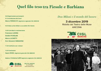 «Quel filo teso tra Fiesole e Barbiana: Don Milani e il mondo del lavoro». È questo il titolo del seminario – domani alle 9 al Ridotto delle Muse – dedicato al ricordo della figura di don Lorenzo Milani, ispiratore di più generazioni di sindacaliste e sindacalisti che hanno tratto e traggono, ancora oggi, ispirazione dalle parole e dalle azioni del sacerdote fiorentino. La Cisl Marche nell’occasione presenterà il ciclo di iniziative che si svolgeranno nell’arco del 2020, anno in cui ricorre del 70° anniversario della fondazione del sindacato confederale. «La riflessione su don Milani vuole essere per la Cisl delle Marche un punto di ripartenza – scrive la sigle in una nota – per intercettare la sfida educativa, politica, e sindacale legata alle nuove fragilità sociali ed economiche del territorio marchigiano».