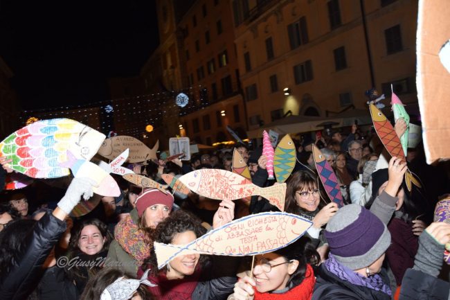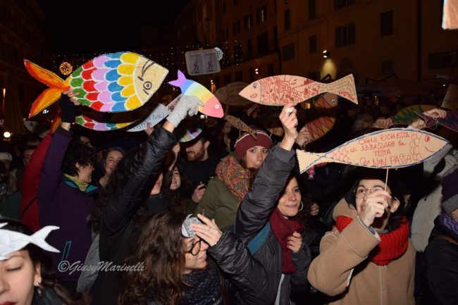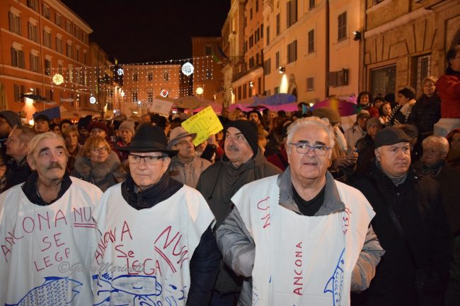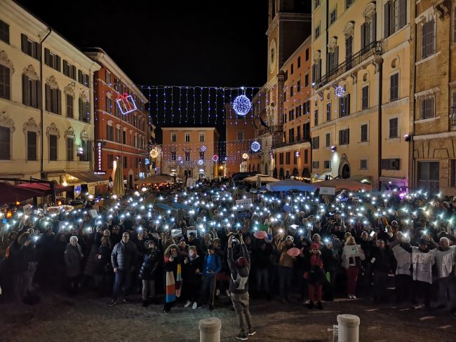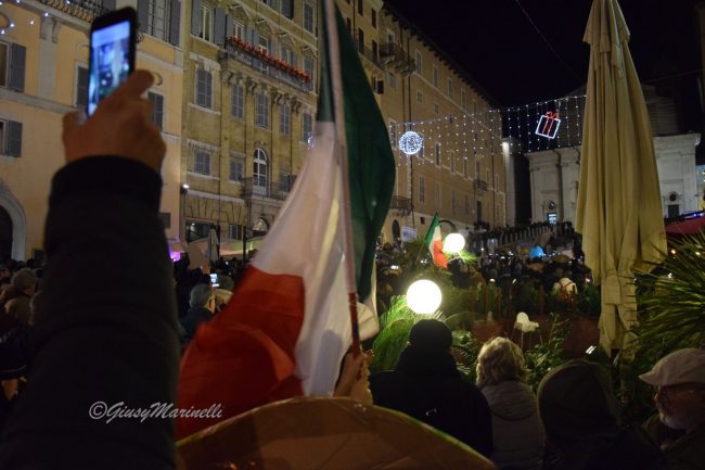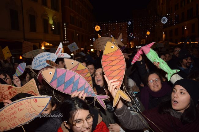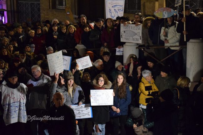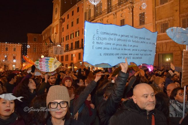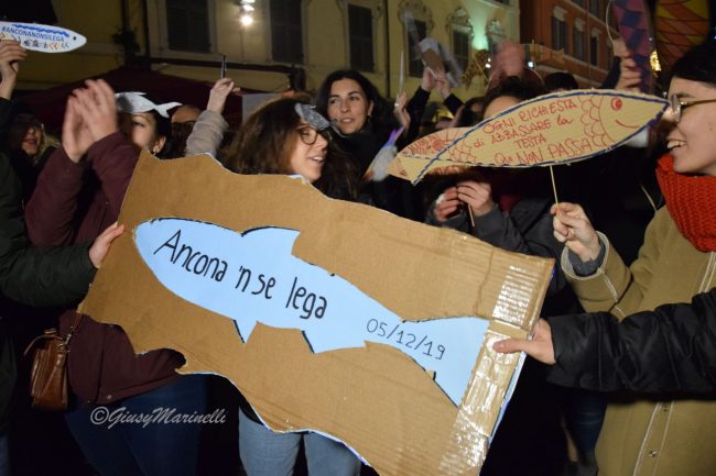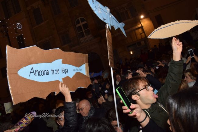 I cento passi dei Modena City Ramblers. Come è profondo il mare di Lucio Dalla, Inno di Mameli e, come da tradizione, “O bella ciao”, l’inno della lotta partigiana che ha risuonato in tutte le città italiane battute dalle sardine. Una manifestazione in luci e musica quella che ha illuminato il salotto buono di Ancona, con piazza del Papa invasa da oltre 2mila sardine.