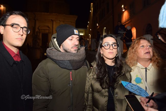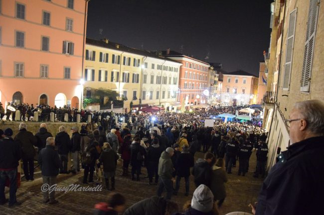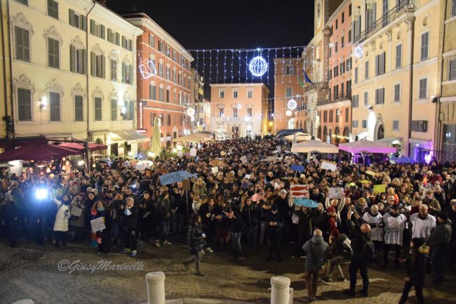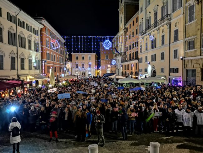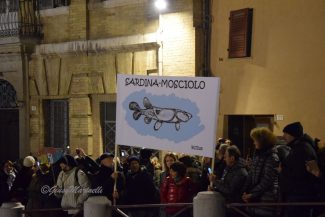 E dato che il punto d’approdo dei tanti arrivati da nord a sud delle Marche è il capoluogo dorico, nei cartelloni si affiancano i moscioli alle sardine. «Le piazze sono aperte e c’è chiunque voglia rivendicare i valori dell’antifascismo, dell’antirazzismo e dell’antiviolenza, in maniera pacifica. I veri partigiani di oggi siete voi», sottolinea Lorenzo Donnoli, del coordinamento nazionale del movimento 6000 sardine, in trasferta ad Ancona. Il fondatore delle sardine made in Marche, Giorgio Mattiuzzo, ha invece citato tutti i «fatti gravi» avvenuti nella regione: «A partire dall’attacco omofobo fuori di una discoteca di Pesaro, passando per l’aggressione verbale ad una donna di colore su un autobus ad Ancona, solo perché non capiva la lingua, fino alla cena con simboli fascisti ad Ascoli Piceno. Vogliamo ricordare che ci sono persone che credono in altri valori, perché il 33% non è il 100% degli italiani». Dal palco si elencano poi alcuni articoli della Costituzione e si parla del sisma «nemico malvagio e barbaro, che a volte arriva di notte». Presenti il presidente del Consiglio regionale, Antonio Mastrovincenzo, l’ex rettore della Politecnica Sauro Longhi, il capogruppo Pd di Ancona Michele Fanesi e il consigliere di Altra Idea di Città Francesco Rubini. Una manifestazione dal valore simbolico, a stretto giro di posta dalla conferenza della leader di Fratelli d’Italia Giorgia Meloni alle 15,30 (leggi l’articolo). Leader fischiata dalla piazza: «I diritti sono di tutti». E poi la frecciata all’apparato di comunicazione che segue Matteo Salvini: «La Bestia non esiste, e se ne stanno accorgendo anche loro. Non ha chance contro le piazze». Le Sardine in conclusione hanno lanciato l’appello a partecipate tutti alla manifestazione a Roma del 14 dicembre, con “Libertà è partecipazione” di Gaber.