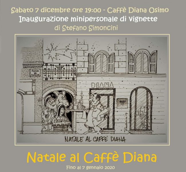 Inaugurata ieri, sabato 7 dicembre, al Caffè Diana di Osimo una mini mostra personale di vignette di Stefano Simoncini, libero professionista, ex sindaco di Osimo e ‘matita’ pungente per passione. Le illustrazioni umoristiche, tutte o quasi a tema natalizio, ironizzano sulle sempre più pressanti problematiche ambientali, sugli adempimenti fiscali di fine anno, sulla perenne crisi economica per giungere ai recenti disastri idrogeologici. Alcune di queste sono estrapolate dal volume “Tratti da Geometra, vignette da Il Calendario del Geometra e non solo”, altre inedite. «Affidare all’ironia dell’amico Stefano Simoncini la parete del caffè dedicata alle esposizioni temporanee è un modo divertente per accogliere i clienti nelle prossime festività Natalizie» ha dichiarato il titolare dello storico caffè osimano Alessandro Dolciotti. In mostra anche l’inedito Calendario umoristico 2020 firmato Simoncini. L’esposizione chiuderà il 7 gennaio 2020.
