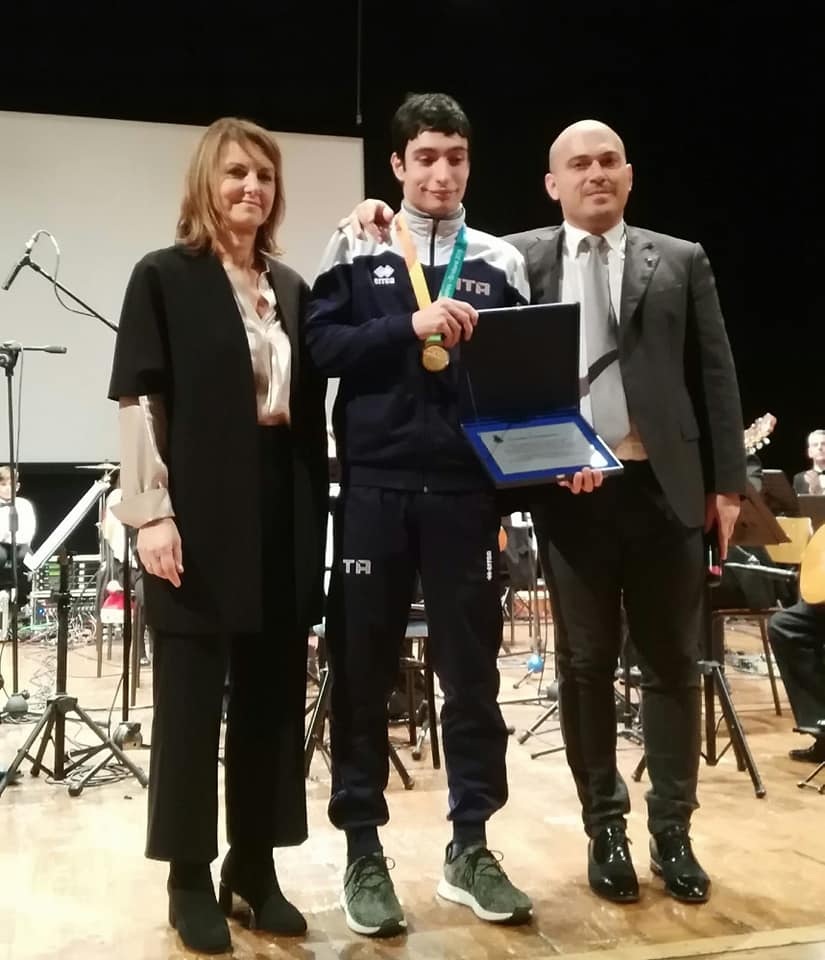 La  vice sindaco Paola Andreoni ed il sindaco Simone Pugnaloni con il giovane atleta Gaetano Schimmenti sul palco del teatro La Nuova Fenice