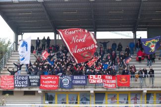 La cronaca. Squadre che entrano in campo in maniera speculare e pronte a giocarsi tre punti fondamentali in ottica play off. Dopo cinque minuti l’Anconitana ha una doppia occasione (prima con Liccardi e poi con Ambrosini) ma non riesce a portarsi in vantaggio. Intorno alla mezz’ora Mansour, tutto solo davanti alla porta, calcia a lato la palla del vantaggio. Un minuto dopo i dorici trovano il gol con Liccardi, ma l’arbitro annulla la rete per fuorigioco. Intorno al quarantesimo il tandem Mansour-Ambrosini confeziona la rete che sblocca il match: il numero 10 crossa ed il bomber incorna la palla dell’1 a 0. Un giro di lancette e Marini impatta la sfera non lasciando scampo a Battistini, siglando l’1 a 1 col quale termina anche la prima frazione. Appena riprende il secondo tempo gli ospiti hanno subito un calcio d’angolo dal quale nasce la rete del 2 a 1: Pierandrei si avventa sulla palla e devia in rete. Dieci minuti più tardi è ancora Pierandrei a freddare Battistini, approfittando di un regalo di Mercurio: 1 a 3 per il Marina. Al ventesimo esatto Ambrosini calcia e con freddezza batte Medici con un diagonale imprendibile fissando il punteggio sul 2 a 3. Accorciate le distanze l’Anconitana crede nel pareggio ed inizia ad attaccare a testa bassa. Intorno alla mezz’ora viene annullato un altro gol ai biancorossi, stavolta per fuorigioco di Giambuzzi, tra i fischi dei tifosi di casa. Quando manca ormai poco al termine e con i dorici sono sbilanciati in avanti, il Marina piazza il colpo del ko: dopo aver superato quasi tutta la difesa palla al piede, Pierandrei arma il tiro e sigla la tripletta personale. È il definitivo 2 a 4 per gli ospiti, che senza timori reverenziali disputano una partita gagliarda al Del Conero. Giornata storta ed amara invece per l’Anconitana che non riesce ancora a dare continuità ai risultati e vede la zona play off allontanarsi.