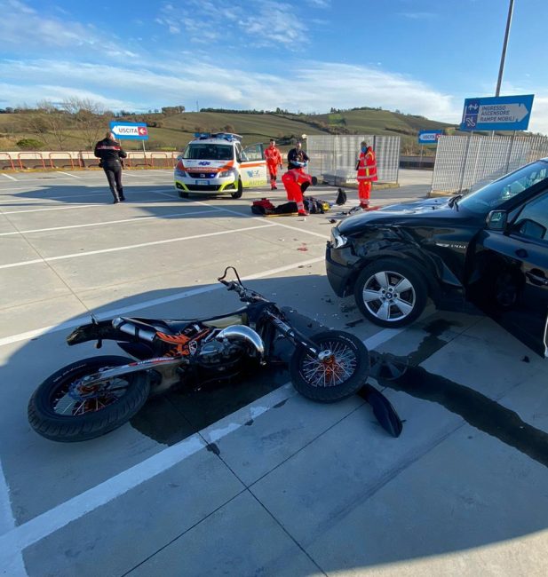 Auto contro moto da cross nel parcheggio sopraelevato del centro commerciale Auchan: due ragazzi a Torrette. L’incidente si è verificato questo pomeriggio sul tetto del complesso di via Scataglini. A scontrarsi, per cause in corso d’accertamento, sono stati una moto e un suv Bmw. A finire in ospedale sono stati i ragazzi in sella al due ruote. Uno è stato trasferito in ospedale con un codice di massima gravità. Le condizioni dell’altro, invece, non sono gravi. I rilievi sono stati affidati ai carabinieri del Norm di Ancona. I soccorsi, invece, sono stati gestiti dalla Croce Rossa e dall’automedica.