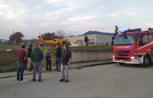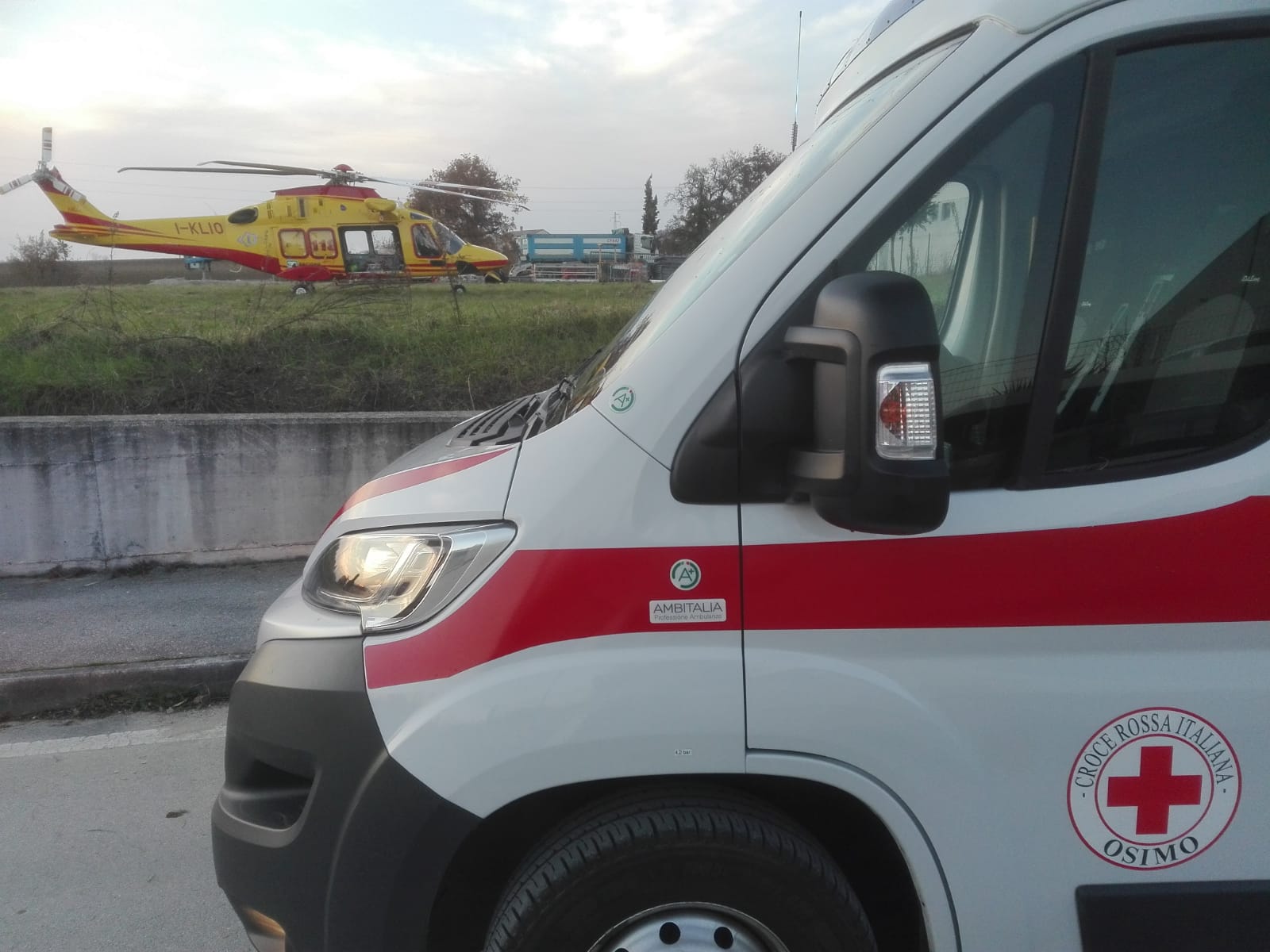 L’eliambulanza arrivata in via dei Tigli a Osimo per soccorrere la persona scivolata nel fosso