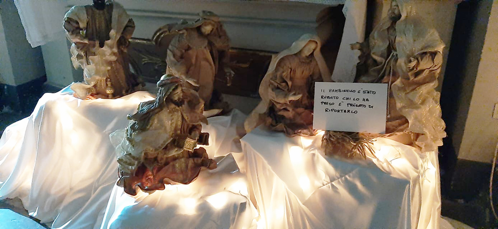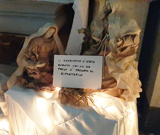 «Chi ha rapito o rubato il Gesù Bambino prima di nascere sicuramente non è un cristiano e non lo ha fatto per metterlo nel proprio presepe. Sarebbe auspicabile quindi che lo riporti al suo posto, tra l’altro è anche un reato. I bambini che hanno lasciato alcune letterine pregando di restituirlo anche fuori il portone della chiesa, hanno sperato di poterlo deporre alla mezzanotte del 24 dicembre. Alla fine, con grande amarezza, la statua è stata sostituita» racconta il manager Maurizio Corte, uno dei tanti fedeli ferito per la vicenda che presenta contorni oscuri. L’episodio è stato segnalato anche alla Polizia locale di Fabriano che ha cercato di analizzare i filmati delle spycam pubbliche della zona, fiduciosa di poter individuare l’autore del gesto ritenuto dai più blasfemo. La chiesa non è infatti video-sorvegliata, è aperta fino a tarda sera ed è anche un po’ buia. Non ci sono testimoni che hanno assistito al raid e, al momento mancano elementi per orientare le indagini. Al bar Storelli temono che in realtà possa essersi trattato di qualcosa di più di un semplice furto. «Quella statua non poteva essere utilizzata per il classico presepe di casa.- fanno osservare- Questo fatto ci ha sconvolto. Ne parlano tutti per come è avvenuto e serpeggia il sospetto che possa essersi trattato di un furto sacrilego, organizzato da qualcuno che partecipa alle messe nere»