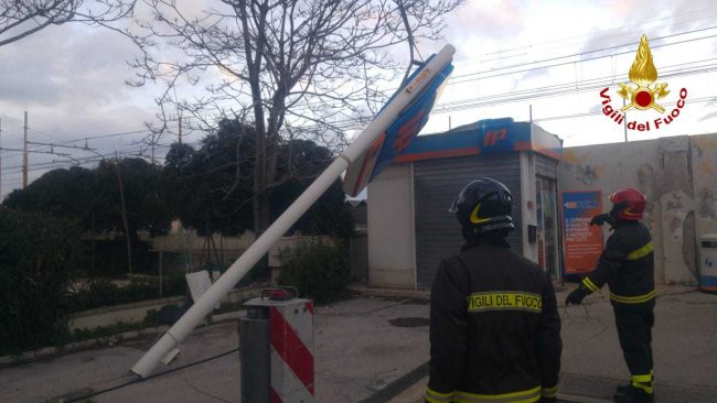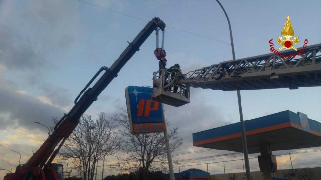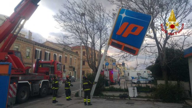 I vigili del fuoco sono intervenuti questo pomeriggio attorno alle 14,30 a Falconara Marittima per la rimozione di un’insegna pericolante installata all’interno di un distributore di benzina. Sul posto, la squadra del 115, con autoscala e autogrù, ha agganciato e rimosso l’insegna. Durante le operazioni il traffico in via Flaminia è stato deviato su strade limitrofe. E’ probabile che le forti raffiche di vento abbiano contribuito al danneggiamento del cartello.