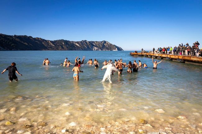 Un tuffo per salutare il 2019 e brindare al nuovo anno. Si è svolto questa mattina al Molo di Portonovo il classico bagno di Capodanno organizzato da Tommaso Buglioni, Diego Belardinelli e Tommaso Verdini. Almeno trenta persone hanno risposto all’appello dei tre amici lanciato principalmente via social. Dopo il tuffo nelle acque gelide, il classico brindisi e un morso al panettone per farsi gli auguri e salutare il nuovo anno.