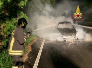 FALCONARA – La vettura avvolta dalle fiamme era ferma su una piazzola di sosta poco dopo la galleria Barcaglione. L’incendio spento dai vigili del fuoco