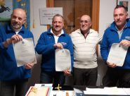 IN ALTO PER RICOSTRUIRE – Marco Capodacqua, Giovanni Dall’Allarmellina e Roberto Pellegrini, i tre protagonisti della scalata ai 7 mila metri, hanno lasciato in Argentina il vessillo del più piccolo comune delle Marche. Il sindaco Pietro Cecoli li ha premiati: «Felici della loro energia e d’aver pensato a noi»