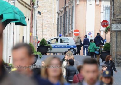 Un’auto della Polizia locale di Osimo nel centro storico (foto Giusy Marinelli)