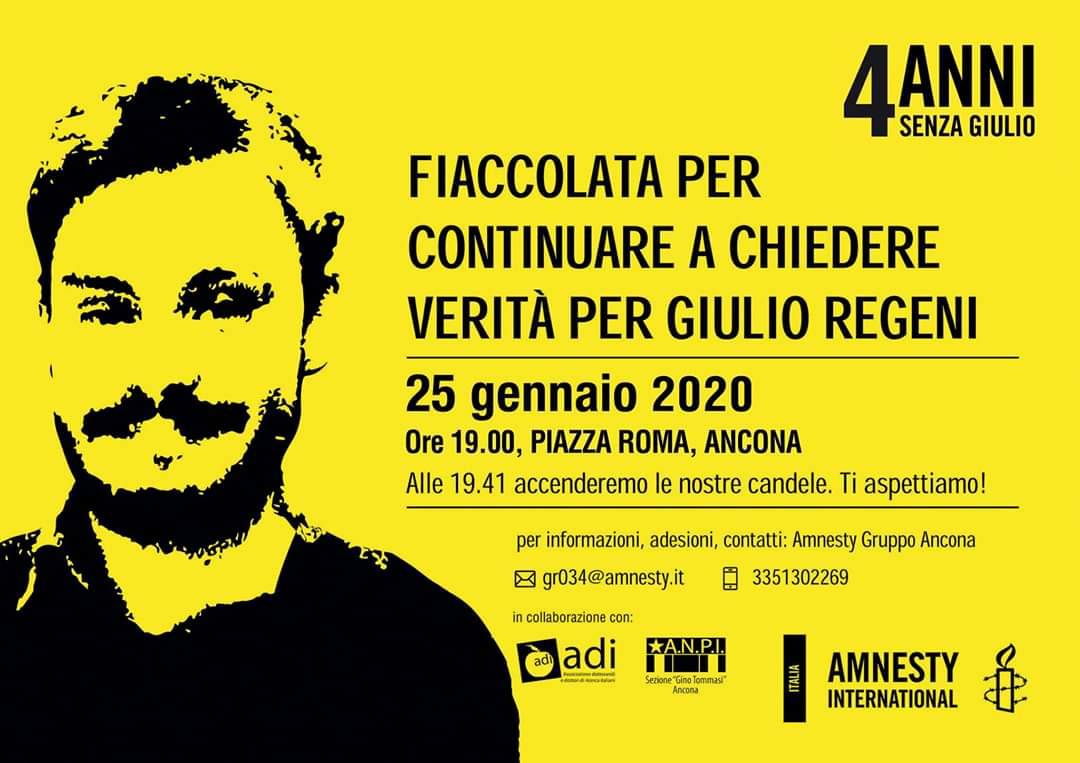 Il 25 gennaio 2016, in un clima di forte tensione per il quinto anniversario dell’inizio delle proteste che portarono alle dimissioni del presidente Hosni Mubarak, è uscito di casa per raggiungere i suoi amici a una festa di compleanno, dove non è mai arrivato. Il suo corpo devastato dalle torture, è stato ritrovato per caso il 3 febbraio nei pressi di Giza, lungo la strada che dal Cairo porta ad Alessandria. Aveva il volto irriconoscibile, su cui «si era abbattuto tutto il male del mondo», ha raccontato Paola, la mamma di Giulio Regeni. «Alle ore 19 del 25 gennaio prossimo – annunciano in una nota congiunta l’Adi, l’Anpi e Amnesty International – ci raduneremo con le nostre fiaccole e rilanceremo la richiesta di verità e giustizia per Giulio Regeni. Alle 19,41 (ultimo contatto con Giulio del 25 Gennaio del 2016) osserveremo un minuto di raccoglimento. Saremo in Ancona in Piazza Roma, a Jesi in Piazza della Repubblica, a Senigallia in Piazza Roma, a Matelica in Piazza Mattei, a Pesaro in Piazza del Popolo, a Porto Recanati in Corso Matteotti (ex scuola Diaz)».
