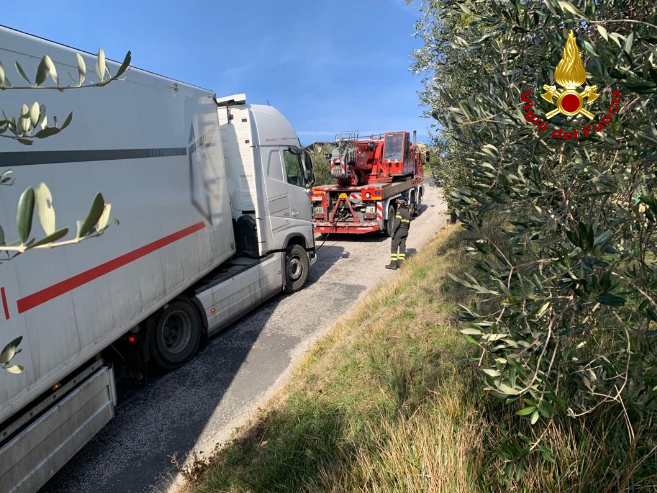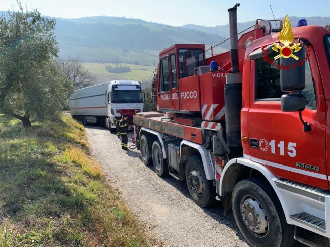L’autoarticolato appesantito dal carico si incaglia su una strada della viabilità secondaria mentre tenta di risalire una china troppo ripida. E’ successo nella tarda mattinata di oggi a Poggio San Marcello. I vigili del fuoco di Jesi sono intervenuti alle ore 11.40 in contrada Coste del Mulino, per il traino di un autoarticolato con il carico a bordo, che era rimasto bloccato lungo una salita di una strada del paese. Il mezzo pesante è stato trainato dall’autogrù, proveniente dalla sede centrale di Ancona, fino al superamento della salita.