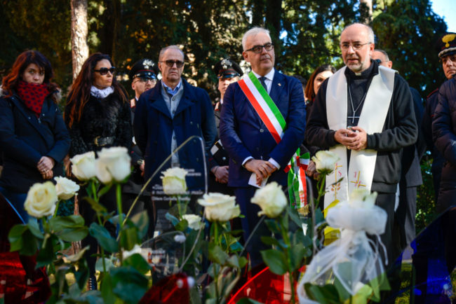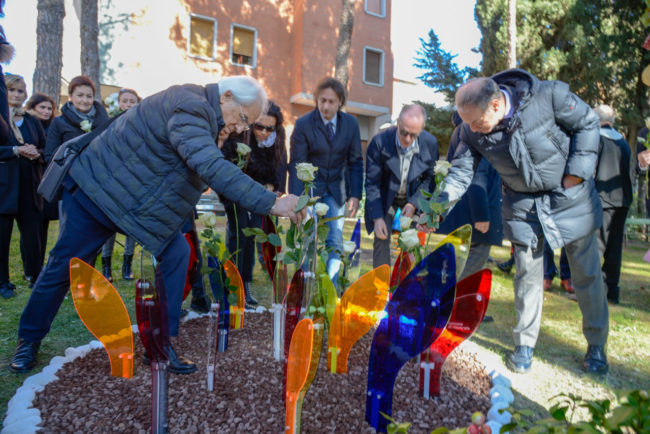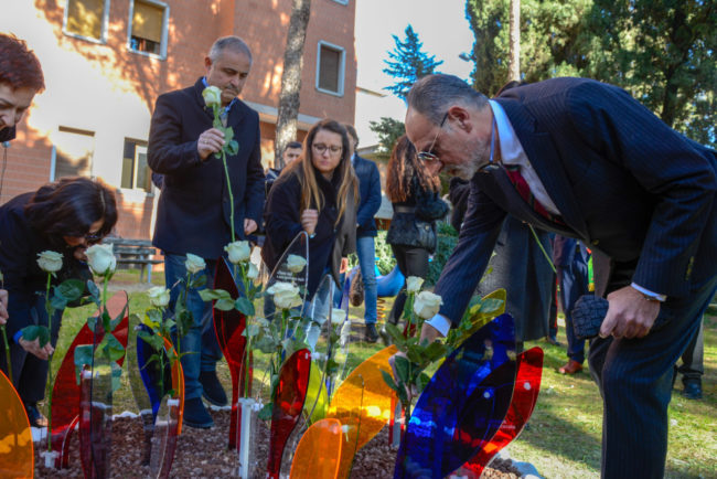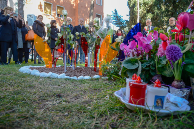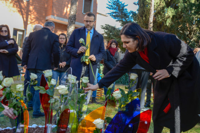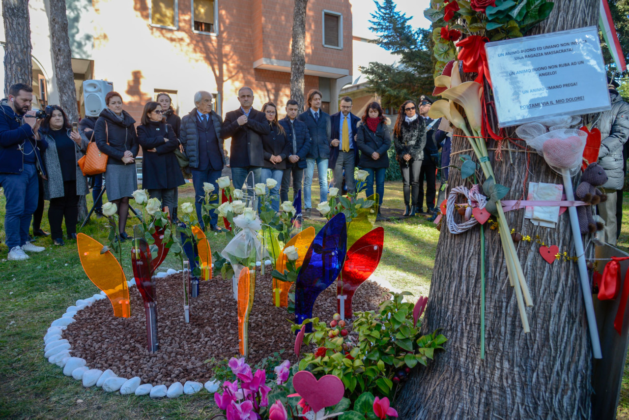 «Tenete sempre vivo il ricordo di Pamela a Macerata, nessuno dovrebbe morire così per mano di persone da me ritenute demoniache, curate questo luogo come fosse il vostro per essere da esempio per i giovani e per il rispetto». Così la mamma di Pamela Mastropietro, Alessandra Verni, nel messaggio letto durante l’inaugurazione dell’installazione nel giardino di via Spalato, a Macerata, di fronte alla palazzina dove la 18enne romana è stata uccisa esattamente due anni fa: il 30 gennaio 2018. «Questo deve essere un luogo di speranza» ha detto il sindaco Romano Carancini nel corso della cerimonia che si è svolta alle 12,30 di questa mattina (qualche minuto di ritardo in attesa dell’arrivo del vescovo Nazareno Marconi). L’installazione sono 18 fiori stilizzati (simili a un grandi petali colorati), uno per ogni anno di Pamela, nei quali sono state inserite 18 rose bianche.