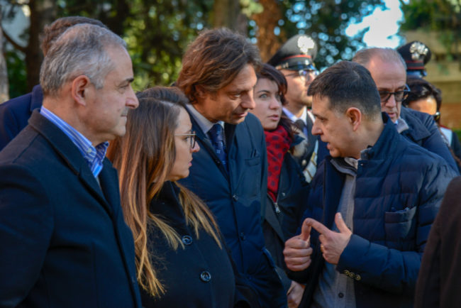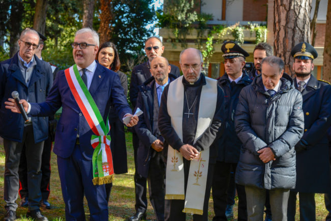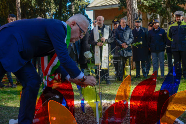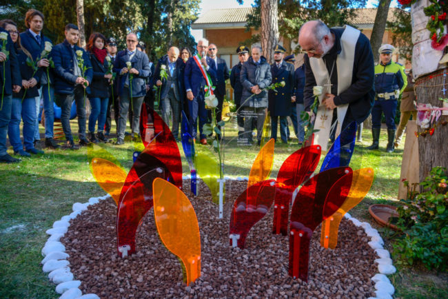 La prima, al centro, l’ha sistemata il sindaco nel petalo dove si legge la frase «Siamo nati e non moriremo mai», di Chiara Corbella Petrillo. «Questo è il terzo segno in ricordo di Pamela a Macerata – ha detto Carancini –. Il primo era stato il 19 febbraio 2018 quando la città scese in strada per manifestare contro la violenza, poi sempre il 19 febbraio, lo scorso anno, per la prima volta nella storia di Macerata, venne commemorata Pamela in Consiglio comunale, e oggi è il terzo segno che vogliamo lasciare. Un segno molto semplice, colorato, coerente con il luogo, direi quasi gioioso perché parla di speranza. È la scelta di 18 fiori stilizzati, diversamente colorati e che hanno in ognuno di essi un’anima destinata a dei fiori vivi». C’è poi la frase di Chiara Corbella Petrillo: «la storia di una donna che si sacrifica per il figlio che deve nascere, ci sembra una dedica alla vita – ha detto ancora il sindaco –, questo il segno che volevamo lasciare, vogliamo che questo luogo sia dedicato alla vita, è la scelta di una città non di una istituzione, la città vuole dare una impronta a quella storia. È un inno alla vita contro la sconfitta della vita che purtroppo abbiamo vissuto due anni fa. Vorremmo che fosse questo un luogo di speranza, lo abbiamo voluto dentro questo spazio verde dove vanno bambini con nonni e genitori, coloro che verranno qui e si siederanno sulle panchine potranno vederlo e raccontare gioia e speranza che va tenuta viva e non deve cedere alla cultura della morte e della violenza». «Da questo grande male è cresciuta una più grande coscienza di difendere i deboli, ogni vita debole e fragile, proprio perché vita, è bellissima e va difesa» ha detto il vescovo. Il presidente del consiglio comunale Luciano Pantanetti: «ognuno di noi in Consiglio ha metabolizzato la tragedia in modo diverso, cerchiamo di aiutare questa comunità ferita da una tragedia così orribile a ricominciare e a correggere errori che si commettono quotidianamente anche se involontariamente».