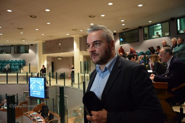 Il sindaco di Fabriano, Gabriele Santarelli, ieri mattina nell’aula del Consiglio regionale per ascoltare il dibattito sul Piano Sanitario 2019-2021