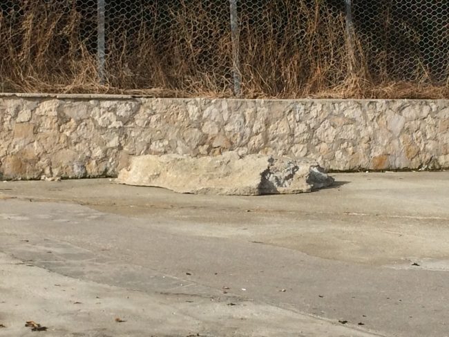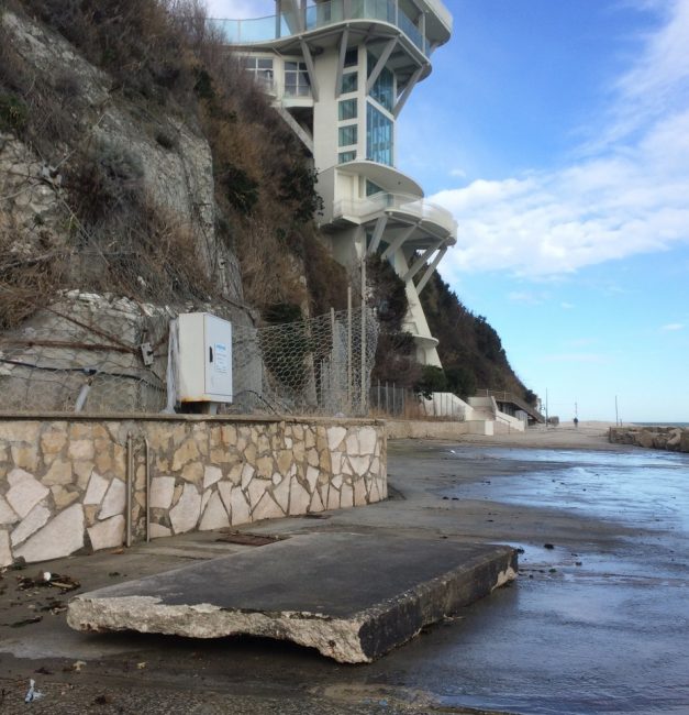 L’Adriatico ha schiaffeggiato di brutto anche la costa anconetana, non risparmiando il litorale del Passetto, con grandi lastre di cemento catapultate da onde alte fino a due metri e mezzo, anche stamattina, fin sotto la rupe. Basta osservare queste foto di stamattina, appunto, scattate proprio alle 10, per capire l’entità dei danni, neanche dalle acque fosse uscito Nettuno in persona per giocare al lancio del peso. “Mare molto mosso”, ieri “raffiche di vento fino a 100 km orari”, “bora polare”, “freddo di origine artico-marittima, con calo della temperatura di 15 gradi”. Tutto previsto dalle allerte meteo scattate già nei giorni scorsi, tutto previsto e noto alla Protezione civile. Ma tant’è. Due piatti blocchi di cemento, probabilmente la notte scorsa, sono stati sradicati dalla pavimentazione e proiettati per ben 15 metri fin sotto le reti di protezione e contenimento della ripida falesia nella zona tra l’ascensore e uno dei bracci di scalinate che conducono al belvedere del Monumento ai Caduti. Una a tre metri dall’inizio della rampa.