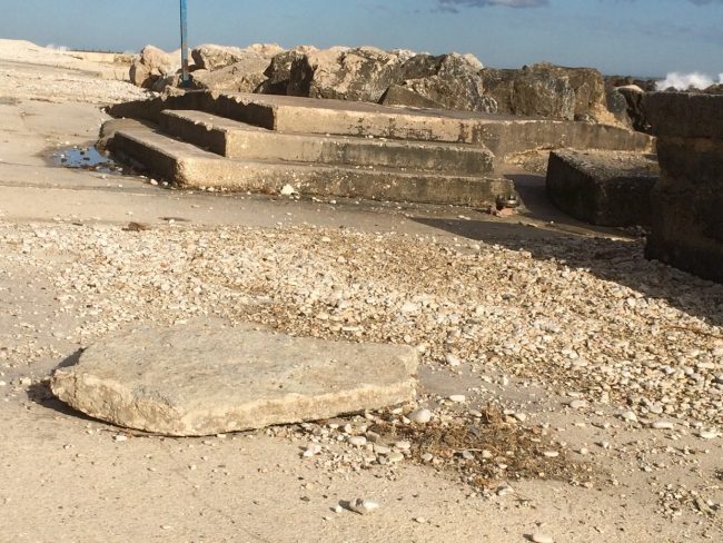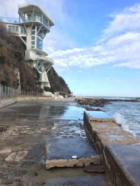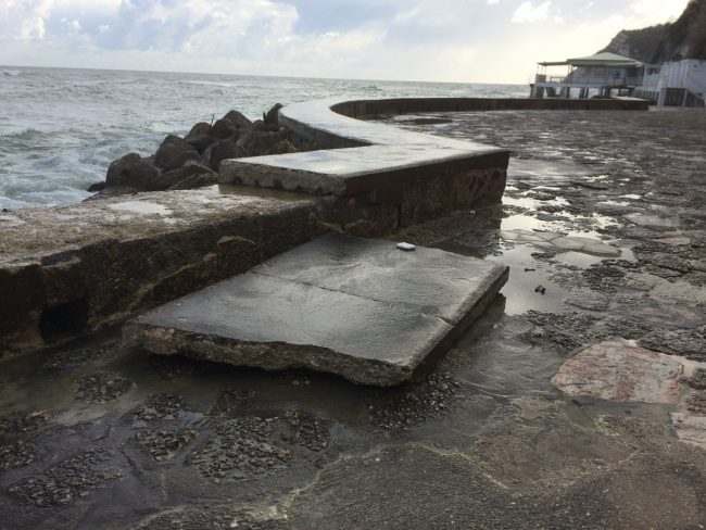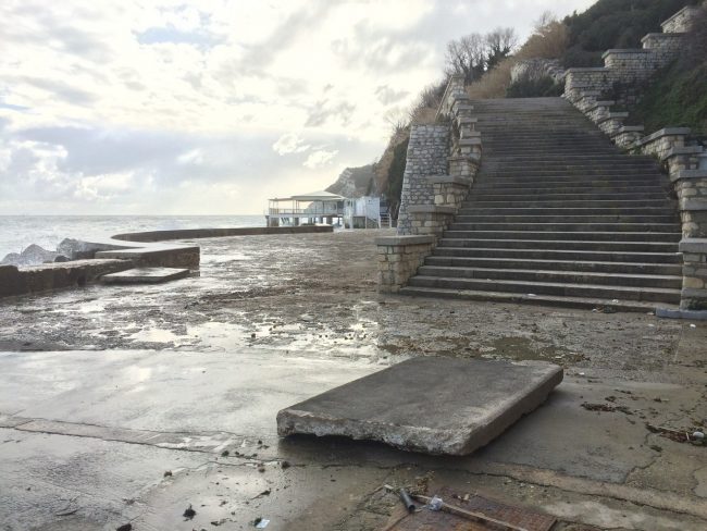 L’Adriatico ha schiaffeggiato di brutto anche la costa anconetana, non risparmiando il litorale del Passetto, con grandi lastre di cemento catapultate da onde alte fino a due metri e mezzo, anche stamattina, fin sotto la rupe. Basta osservare queste foto di stamattina, appunto, scattate proprio alle 10, per capire l’entità dei danni, neanche dalle acque fosse uscito Nettuno in persona per giocare al lancio del peso. “Mare molto mosso”, ieri “raffiche di vento fino a 100 km orari”, “bora polare”, “freddo di origine artico-marittima, con calo della temperatura di 15 gradi”. Tutto previsto dalle allerte meteo scattate già nei giorni scorsi, tutto previsto e noto alla Protezione civile. Ma tant’è. Due piatti blocchi di cemento, probabilmente la notte scorsa, sono stati sradicati dalla pavimentazione e proiettati per ben 15 metri fin sotto le reti di protezione e contenimento della ripida falesia nella zona tra l’ascensore e uno dei bracci di scalinate che conducono al belvedere del Monumento ai Caduti. Una a tre metri dall’inizio della rampa.