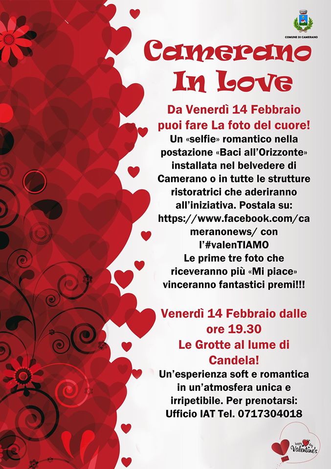 La postazione, dal nome“Baci all’Orizzonte,” ha uno scopo ben preciso, spiega il Comune: attirare gli innamorati e far scattare un selfie del loro bacio più speciale. Lo stesso selfie potrà essere immortalato anche in tutte quelle strutture che hanno aderito all’iniziativa e che sono contraddistinte da un logo: Bistro’ Cucina & Vini, Maffy Camera Cafe’, Mente Locale, il Piccolo Birrificio Agricolo Sangermano18, e la Cioccolateria Sei Sensi. Le foto potranno essere pubblicate sulla pagina Facebook Ufficiale del Comune di Camerano-Cameranonews utilizzando l’#valenTIAMO e le prime tre che otterranno più like, verranno premiate. “Camerano In Love” riserva anche una sorpresa romantica in grotta. A partire dalle 19.30 è possibile partecipare “Grotte al Lume di Candela”, un’esperienza romantica nel cuore della città sotterranea del paese. Prenotazione obbligatoria presso l’Ufficio IAT di Camerano, tel. 0717304018.
