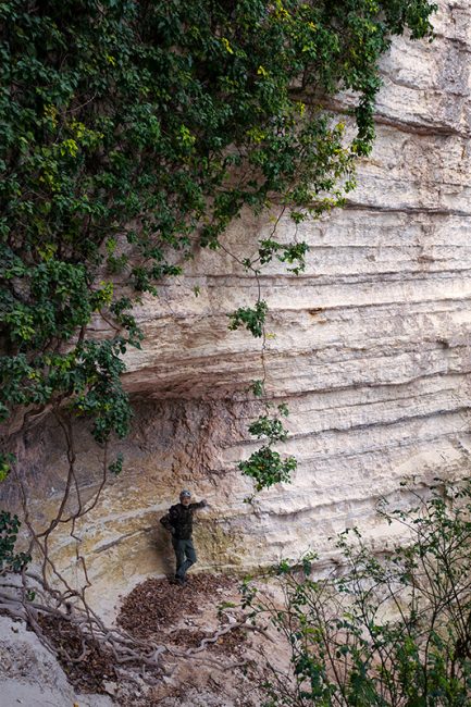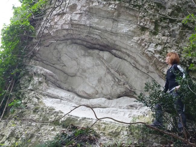 «Voglio qui parlare di un sito estremamente bello, dove la natura si esprime ai  massimi livelli. L’ultima volta che ci siamo stati una bellissima poiana ci si è parata davanti. È la Valle ombrosa – sottolinea Burattini – ci si arriva da un sentiero antichissimo, a tratti inciso nella roccia, con cenge, scalette e grottini, che porta nel cuore selvaggio del Conero. Qui in un canalone fuori dallo stradello si apre un’incredibile cavità, occultata dal gioco di prospettive e dalle cascate d’edera, la “Grotta ombrosa”, insieme ai miei amici esploratori l’abbiamo scoperta con grande stupore a seguito di meticolose esplorazioni. La si nota solo quando ci si trova al suo cospetto». Bianca, immersa in una perenne ombra e quindi ombrosa, è incastonata fra meraviglie geologiche. Ci sono gli affioramenti di maiolica, la roccia più antica visibile sul Conero. E in fronte al suo ingresso si scorge nitido il grande fossile di una frana sottomarina, una nicchia affusolata come un occhio, disegnata su un dirupo da primordiali sedimenti plastici di roccia. «La Grotta ombrosa è misteriosa, i monaci medioevali non l’hanno mai tracciata sui loro documenti – ricorda la guida – Probabile che fosse un nascondiglio da tenere celato, soprattutto dagli approdi dei pirati. Probabile sia stato un rifugio per banditi, che conoscevano a menadito i segreti più intimi del Monte. Il Conero nel ‘700 ne era infestato. Le piste che si diramano dalla zona e si perdono nella selva le girano alla larga, quasi a volerla tenere lontano dagli occhi. Di quegli stradelli rimangono solo antichi segmenti qua e là. Oggi, data la mia età, ho 68 anni, mi sono deciso a pubblicare tutte le mie conoscenze, prima che finissero nel dimenticatoio e nell’oblio». La sua passione per il monte Conero è nata da bambino, quando il nonno cavatore di pietra e agricoltore lo portò per mano sul Passo del Lupo: «Ricordo perfettamente l’emozione. Da allora non ho mai smesso di esplorare».