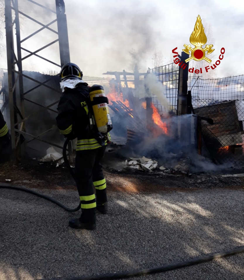 Incendio in un deposito di materiale legnoso che ha coinvolto anche un deposito di materiale edile e un traliccio elettrico a media tensione.