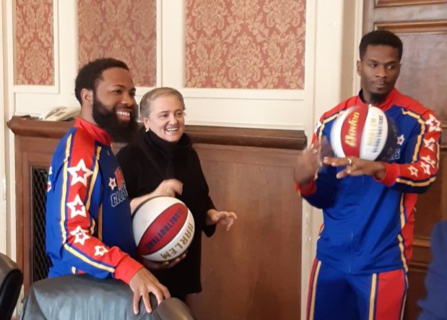 Due giocatori dell’Harlem con il sindaco Mancinelli e l’assessore Guidotti