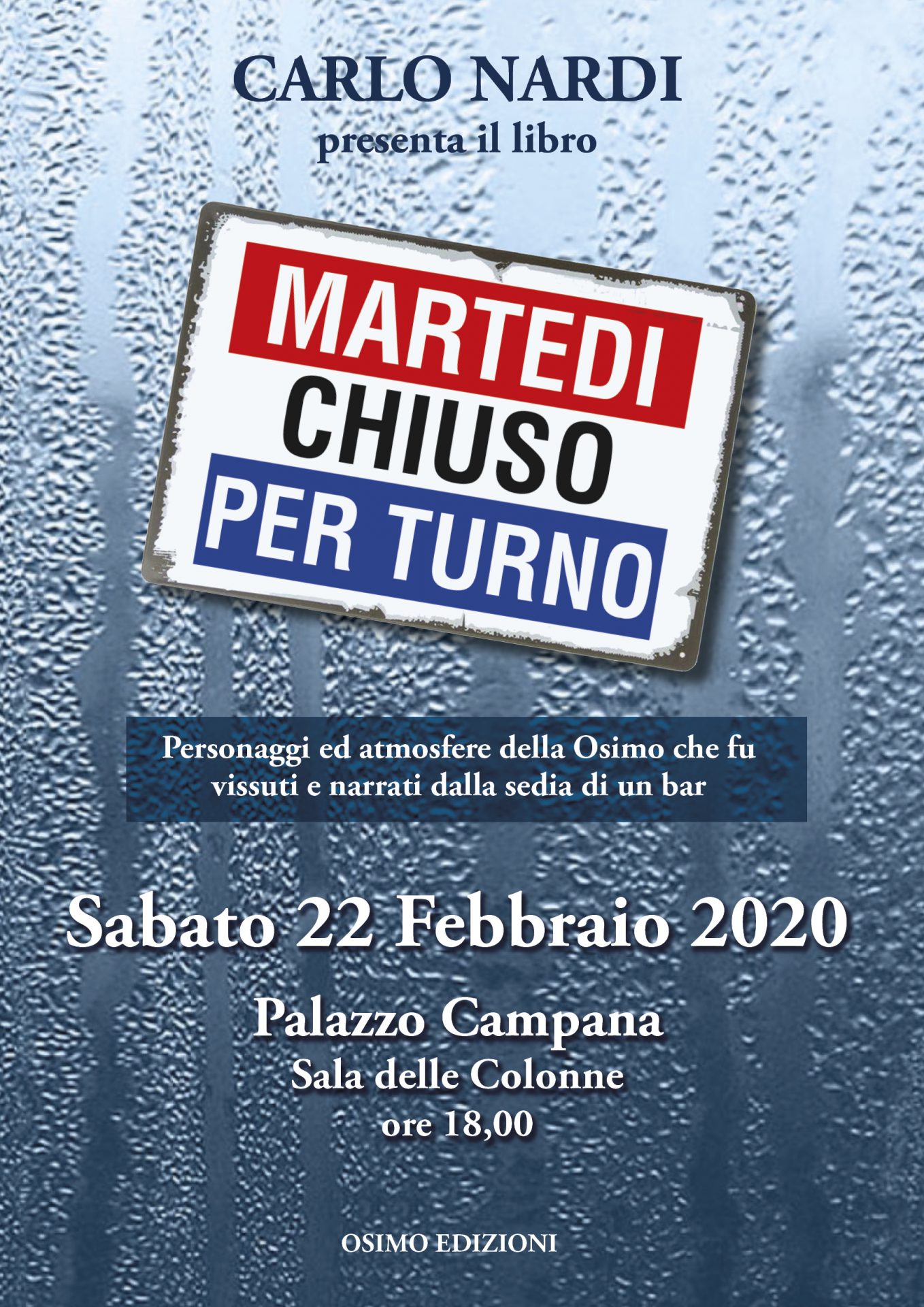 ‘Martedì chiuso per turno’ è il primo libro dell’osimano Carlo Nardi. Vuole essere una galleria di ricordi legati a personaggi e fatti osimani che la narrazione per capitoli percorre, prendendo spunto da articoli apparsi tra il 2018 ed il 2019 sul settimanale locale “La Meridiana”, con il quale l’autore collabora.