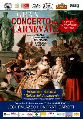 Dopo il consueto esordio di gennaio in chiesa, il Festival Jesi Barocca 2020 vede il suo primo appuntamento a Palazzo Honorati Carotti domenica 23 febbraio, proprio la domenica di Carnevale. In scena un programma musicale di grande stimolo culturale, proposto dall’ensemble barocca “I Solisti dell’Accademia”, specialista del genere con gustoso e poco consueto organico strumentale –violino, flauto dolce, traversiere, corno barocco, clavicembalo- che si esibisce in costume del ‘700 ricreando le atmosfere raffinate delle residenze aristocratiche dell’epoca, al tempo aperte a feste e divertimenti in occasione del periodo carnevalesco. Il programma, di rarissima esecuzione e alto rilievo musicologico, presenta autori italiani accanto a tedeschi in vario modo influenzati da stile e sensibilità compositiva delle diverse Scuole musicali d’Italia. Insieme a Vivaldi, autentico faro del barocco, e Sammartini che già apre a sviluppi verso il classicismo, grandi nomi attenti alla lezione italiana come Telemann e Händel, ma anche un quasi ignoto Stölzel (1690-1749), al tempo famoso e di gran moda poi dimenticato: tra le preziose perle proposte, alcune sue sonate a quattro, in cui il dialogo poco consueto di violino, flauti e corno barocco crea sonorità di grande raffinatezza ed estrema godibilità, degne di una festa privata del primo ‘700. Inizio ore 17.30, ingresso 12 euro. (Info e prenotazioni: 0731-4684; 338-8388746; info@fondazionelanari.it).