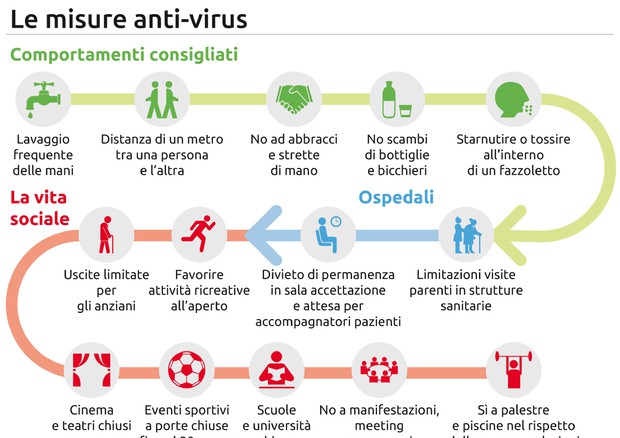 Il decreto firmato dal premier Conte prevede: la sospensione dei congressi, le riunioni, i meeting e gli eventi sociali, in cui è coinvolto personale sanitario o personale incaricato dello svolgimento di servizi pubblici essenziali o di pubblica utilità. Sono sospese anche le manifestazioni e gli eventi di qualsiasi natura, svolti in ogni luogo, sia pubblico sia privato, che comportano affollamento di persone tale da non consentire il rispetto della distanza di sicurezza interpersonale di almeno un metro. Sono sospesi gli eventi e le competizioni sportive di ogni ordine e disciplina, svolti in ogni luogo, sia pubblico sia privato; «resta comunque consentito, nei comuni diversi da quelli di cui all’allegato 1 al decreto del Presidente del Consiglio dei ministri 1° marzo 2020, e successive modificazioni (i comuni della ‘zona rossa’), lo svolgimento dei predetti eventi e competizioni, nonché delle sedute di allenamento degli atleti agonisti, all’interno di impianti sportivi utilizzati a porte chiuse, ovvero all’aperto senza la presenza di pubblico». E’ vietato per gli accompagnatori dei pazienti di permanere nelle sale di attesa dei dipartimenti emergenze e accettazione e dei pronto soccorso (DEA/PS), salve specifiche diverse indicazioni del personale sanitario preposto; è vietato l’accesso di parenti e visitatori a strutture di ospitalità e lungo degenza, residenze sanitarie assistite (RSA) e strutture residenziali per anziani. Per quanto riguarda la sospensione delle lezioni, i dirigenti scolastici, sentito il collegio dei docenti, dovranno attivare, dove possibile, la modalità di didattica a distanza avendo anche riguardo dellle specifiche esigenze degli studenti con disabilità.