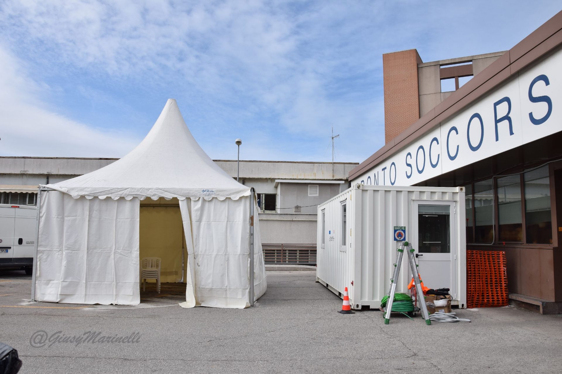 Il percorso di pre triage esterno montato oggi all’ospedale di Torrette per accogliere i casi sospetti di pazienti da sottoporre a tampone (foto Giusy Marinelli)