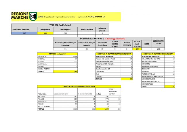 Coronavirus: nell’Anconetano sono 38 i casi registrati. In isolamento domiciliare 291 persone. Quasi la metà sono operatori sanitari. Sono questi i dati forniti dal Gores nel corso dell’ultimo aggiornamento sull’emergenza sanitaria legata al Covid-19. Per quanto riguarda l’ospedale di Torrette, i ricoveri registrati per Coronavirus sono 32. Tre pazienti sono ricoverati in Terapia Intensiva, il resto negli altri reparti: 15 a Malattie Infettive, 12 al pronto soccorso e due a Medicina Generale. Altri tre pazienti sono gestiti dall’Inrca. Questa mattina, a Torrette, è stato registrato il sesto decesso da Coronavirus nelle Marche: si tratta di un uomo di 59 anni affetto da patologie pregresse. Dei 283 in isolamento domiciliare, solo otto hanno mostrato sintomi riconducibili al Covi-19. In quarantena anche 122 operatori sanitari. A livello regionale, sono 235 i componenti del comparto medico-infermieristico costretti all’isolamento. Secondo i dati del Gores, i tamponi positivi nelle Marche sono 200. La maggior parte di questi appartiene alla provincia di Pesaro-Urbino, dove i contagiati hanno raggiunto quota 152. A seguire, la provincia di Ancona con 38 casi, quella di Macerata con 7 e Fermo con 3 tamponi positivi. Il numero di ricoveri è maggiore nei presidi di Marche Nord. Negli ospedali di Pesaro, Fano e Urbino ci sono 22 pazienti in Terapia Intensiva, 46 negli altri reparti. Dall’inizio del contagio, purtroppo, non si sono riscontrati casi di guarigione o dimissioni dagli ospedali.
