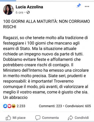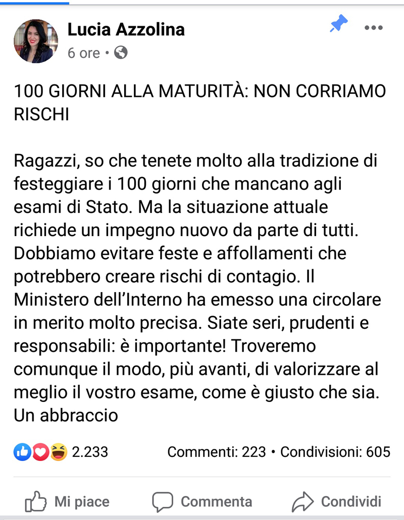 «100 Giorni alla maturità: non corriamo rischi. Ragazzi, so che tenete molto alla tradizione di festeggiare i 100 giorni che mancano agli esami di Stato. -ha scritto in un post poche ore fa il ministro Lucia Azzolina – Ma la situazione attuale richiede un impegno nuovo da parte di tutti. Dobbiamo evitare feste e affollamenti che potrebbero creare rischi di contagio. Il Ministero dell’Interno ha emesso una circolare in merito molto precisa. Siate seri, prudenti e responsabili: è importante! Troveremo comunque il modo, più avanti, di valorizzare al meglio il vostro esame, come è giusto che sia». L’Istituto Istruzione Superiore Savoia Benincasa di Ancona ha subito condiviso l’appello del ministro ad evitare i festeggiamenti per i 100 giorni.«Sappiamo che le misure disposte sono particolarmente dure, ma sono assolutamente necessarie per mitigare l’epidemia in atto.- ha scritto la scuola di Ancona oggi pomeriggio sui social media – Ciascuno di noi è chiamato a fare la propria parte, ogni giorno. Vi ringraziamo per la collaborazione».