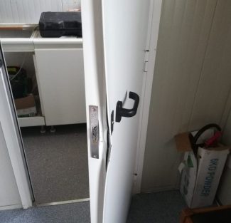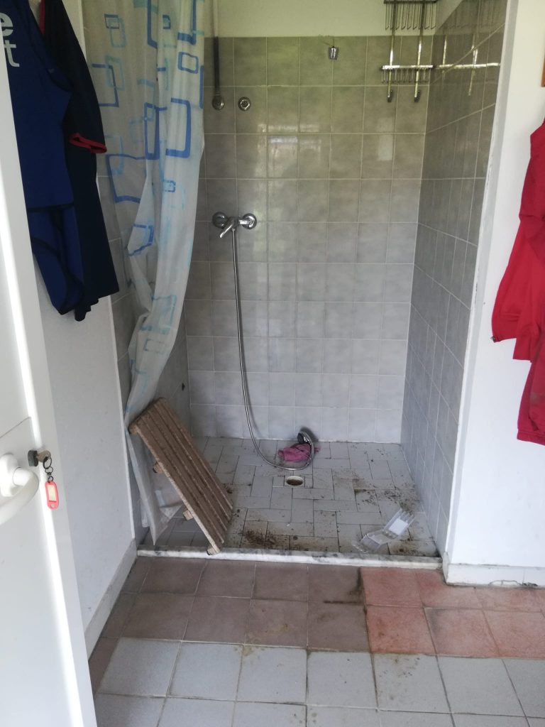 i segni di effazione sulla porta dell’ufficio nello spogliatorio del campo sportivo di San Biagio di Osimo