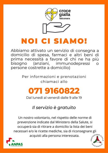 Coronavirus, la Croce Gialla di Falconara in campo per le persone più fragili. E’ stato attivato un servizio di consegna a domicilio, totalmente gratuito, a favore di anziani, immunodepressi e persone costrette a casa per motivi di salute. I volontari possono portare la spesa, medicine e beni di prima necessità. Le prenotazioni, dal lunedì al venerdì, allo 071 9160822.