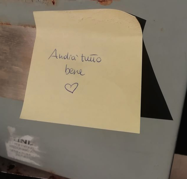 Lo stesso pensiero gentile ieri mattina è stato ‘diffuso’ da un anonimo/a che ha lasciato una miriade di post-it gialli nelle cassette postali o sulle serrande dei negozi tra Monte San Vito e Chiaravalle. Parole scritte a mano e corredate di cuoricino che sono servite a stemperare il clima di paura e tensione vissuto da tutti in queste lunghissime giornate.