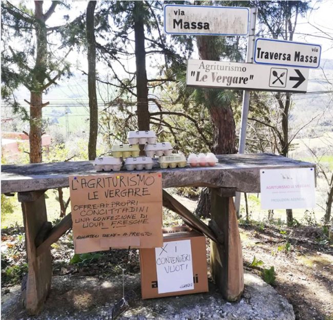 L’agriturismo di Offagna è chiuso come i locali, i negozi , gli alberghi e tutte le strutture ricettive dopo il decreto #iorestoacasa. Per evitare di far finire gli alimenti deperibili nella spazzatura ha deciso di donare le uova fresche ai concittadini del borgo medievale. Un bel gesto quello messo in pratica dall’agriturismo ‘Le Vergare’ che ha scelto di regalare confezioni di cibo non utilizzate e che centra due obiettivi: quello della solidarietà in un momento di emergenza e della lotta allo spreco alimentare. «Data la chiusura forzata ormai da molti giorni, abbiamo deciso di regalare a chi ne vuol usufruire le nostre uova fresche, verranno sostituite ogni giorno se avanzano, in modo di offrirle sempre fresche. – scrive l’azienda agrituristica nel suo annuncio social corredato di foto – Le trovate sul tavolo all’incrocio tra via San Bernardino con via Traversa Massa, se avete vuoti di confezioni da sei, ci faranno comodo. Impastate, impastate, impastate».
